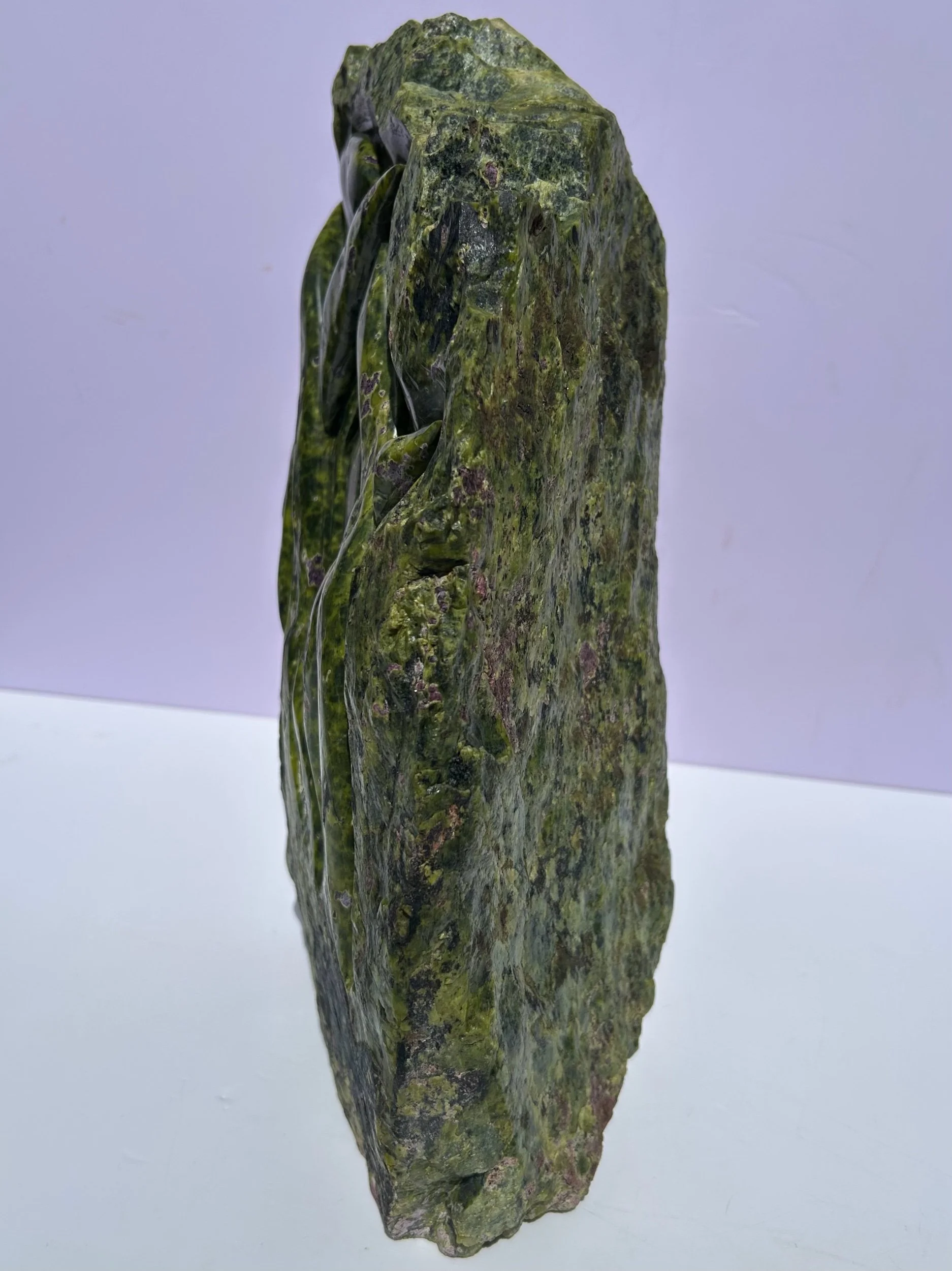 The striking contrast between the vibrant purple stichtite and lush green serpentine makes this specimen truly one of a kind. Bold chromite inclusions add further depth and character to the piece.