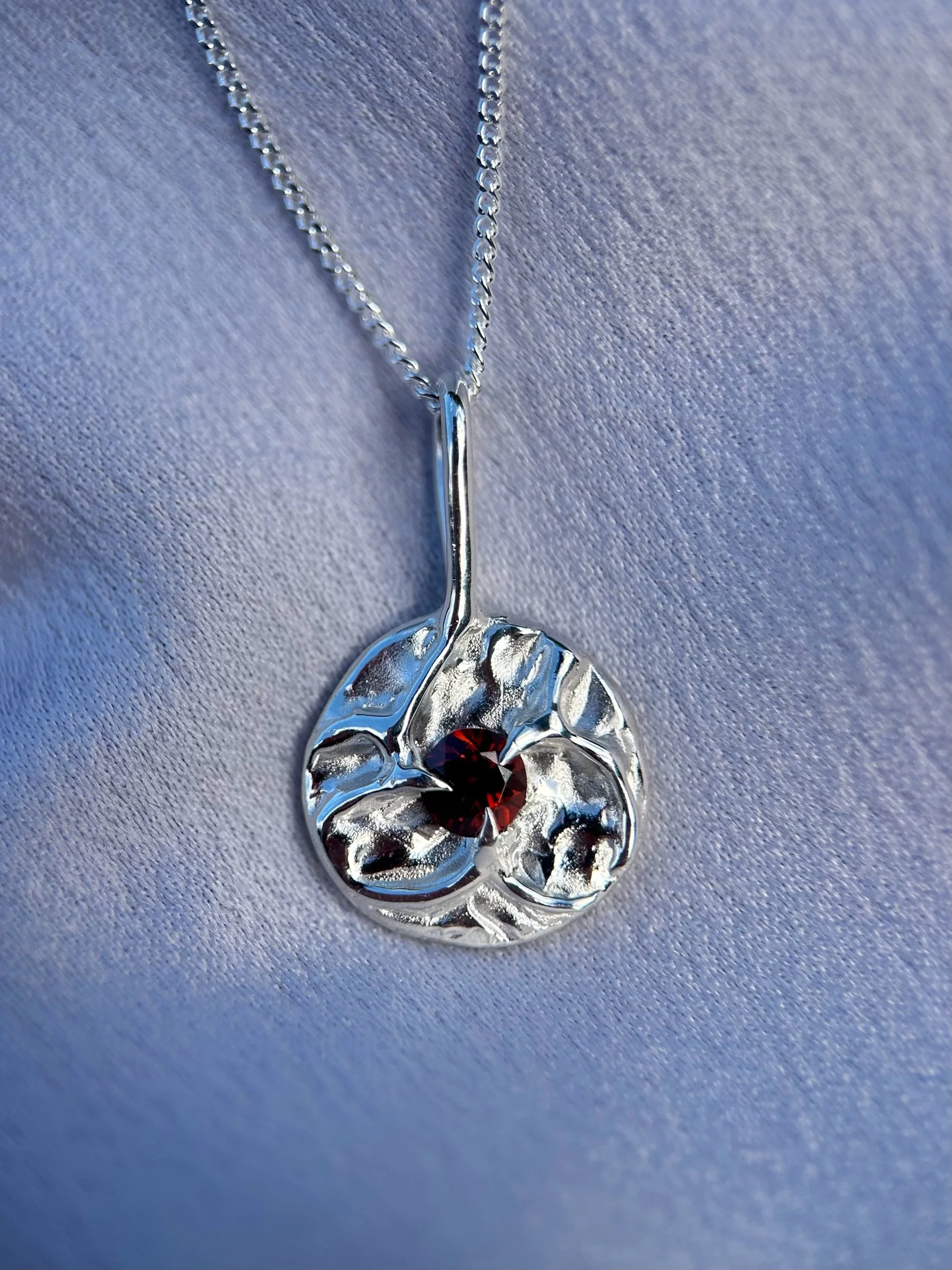 Tasmanian red zircon set into a solid 100% recycled sterling silver coin pendant